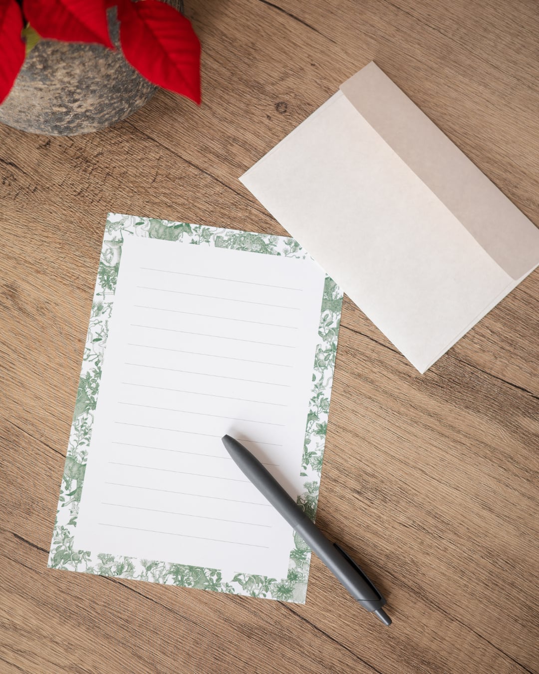 A5サイズのオリジナル便箋15枚と、無地の洋2封筒3枚を組み合わせています。